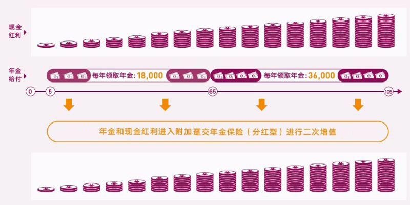 金直到合同满期,给付年金翻一番,源源不断的现金流,至被保险人105岁时,额外一次性给付相当于100%所交主合同年化保费的满期金,高额贺寿添喜,财富尊享一生。